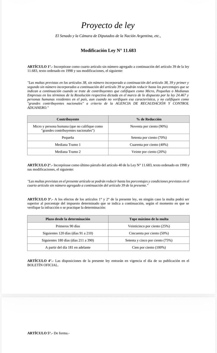 En rigor, el proyecto original de Michel plantea facultar a ARCA a hacer descuentos en las multas de hasta el 90% en el caso de micropymes y personas humanas que no califiquen como grandes contribuyentes. Para las pymes es de hasta el 70%; en las medianas del tramo 1, el 40%; y en las medianas tramo 2, el 20%.