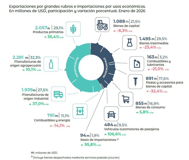 Entre los grandes rubros de exportación, se destacaron los productos primarios (u$s2.057 millones, +35,4% interanual) y las manufacturas de origen industrial (u$s1.939 millones, +37%), mientras que las manufacturas de origen agropecuario sumaron u$s2.281 millones (+10,1%). En contraste, los combustibles y energía retrocedieron 14,1% interanual.